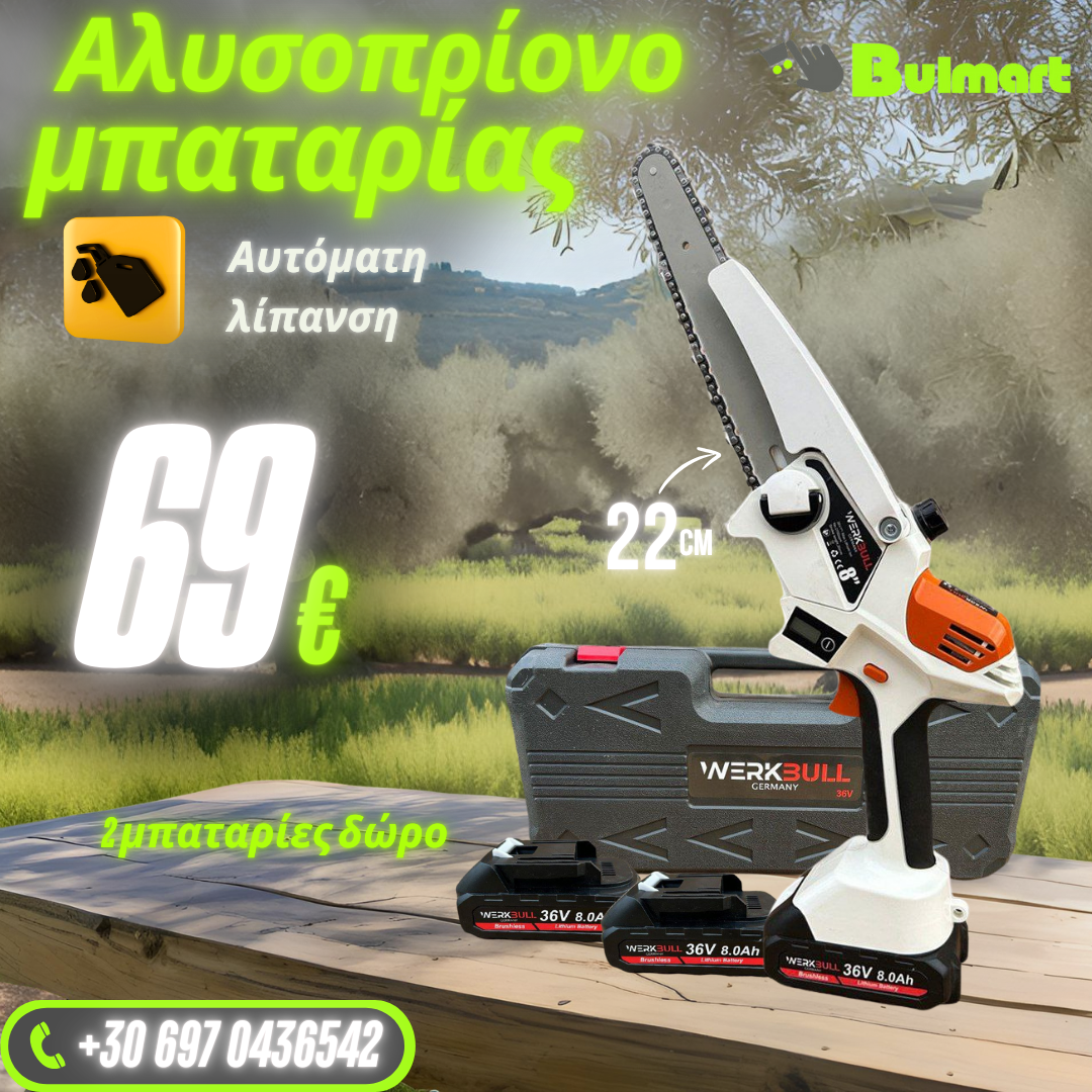 Το νέο γερμανικό αλυσοπρίονο μπαταρίας WerkBull τροφοδοτείται από μια ισχυρή μπαταρία 36v που διαρκεί έως και 360 κοπές πριν από την επαναφόρτιση. Είναι ιδιαίτερα αποδοτικό και έχει χαμηλό επίπεδο θορύβου λειτουργίας. Σε αντίθεση με άλλες μάρκες και μοντέλα, το αλυσοπρίονο μας είναι απόλυτα επικεντρωμένο στην προστασία των πελατών μας κατά τη χρήση, γι' αυτό και διαθέτει προστατευτικό μήκους 15 εκατοστών για τη μέγιστη ασφάλειά τους. Η λαβή με μαλακή λαβή αποτρέπει την ολίσθηση. Το κοπτικό και είναι χωρίς ψήκτρες, γεγονός που συνεπάγεται μεγαλύτερη περίοδο δραστηριότητας. Υπάρχει ρυθμιζόμενη αυτόματη λίπανση της αλυσίδας καθώς και ένδειξη στάθμης λαδιού στο δοχείο. Η αλυσίδα ρυθμίζεται και τεντώνεται αβίαστα και δεν υπάρχει ανάγκη ύπαρξης εργαλείου. Το φρένο ενεργοποιείται με τη χρήση του μπροστινού προστατευτικού χειρός.