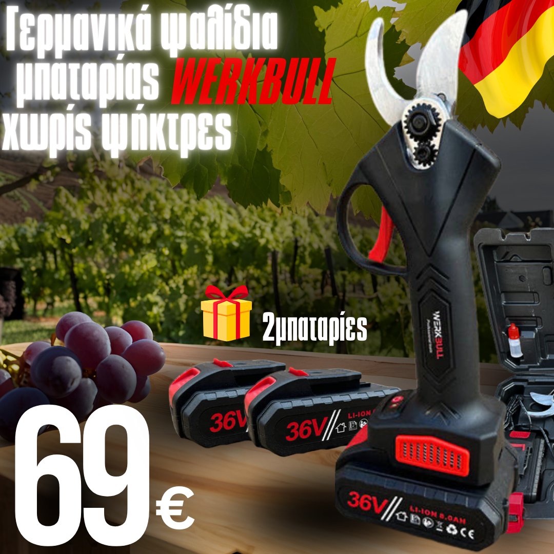 Γερμανικό Ακουστικό Χειροκίνητο Ψαλίδι Κήπου WERKBULL /36V 8Ah/ + δύο μπαταρίες και λάδι